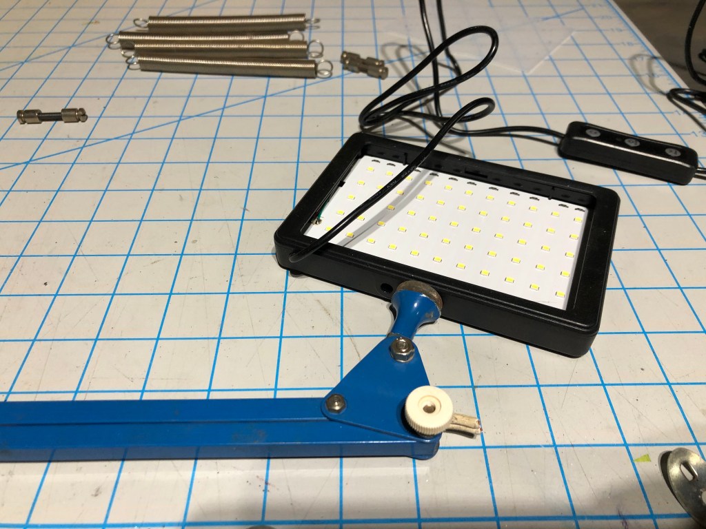 Bench Task Lamp #1: again, a side of the road acquisition, lol. This one was a LOT more work. First off this poor little guy was headless and I had wanted a powerful LED light source for the bench, so I picked up a pair of super bright panels used for photography. Wickedly bright!