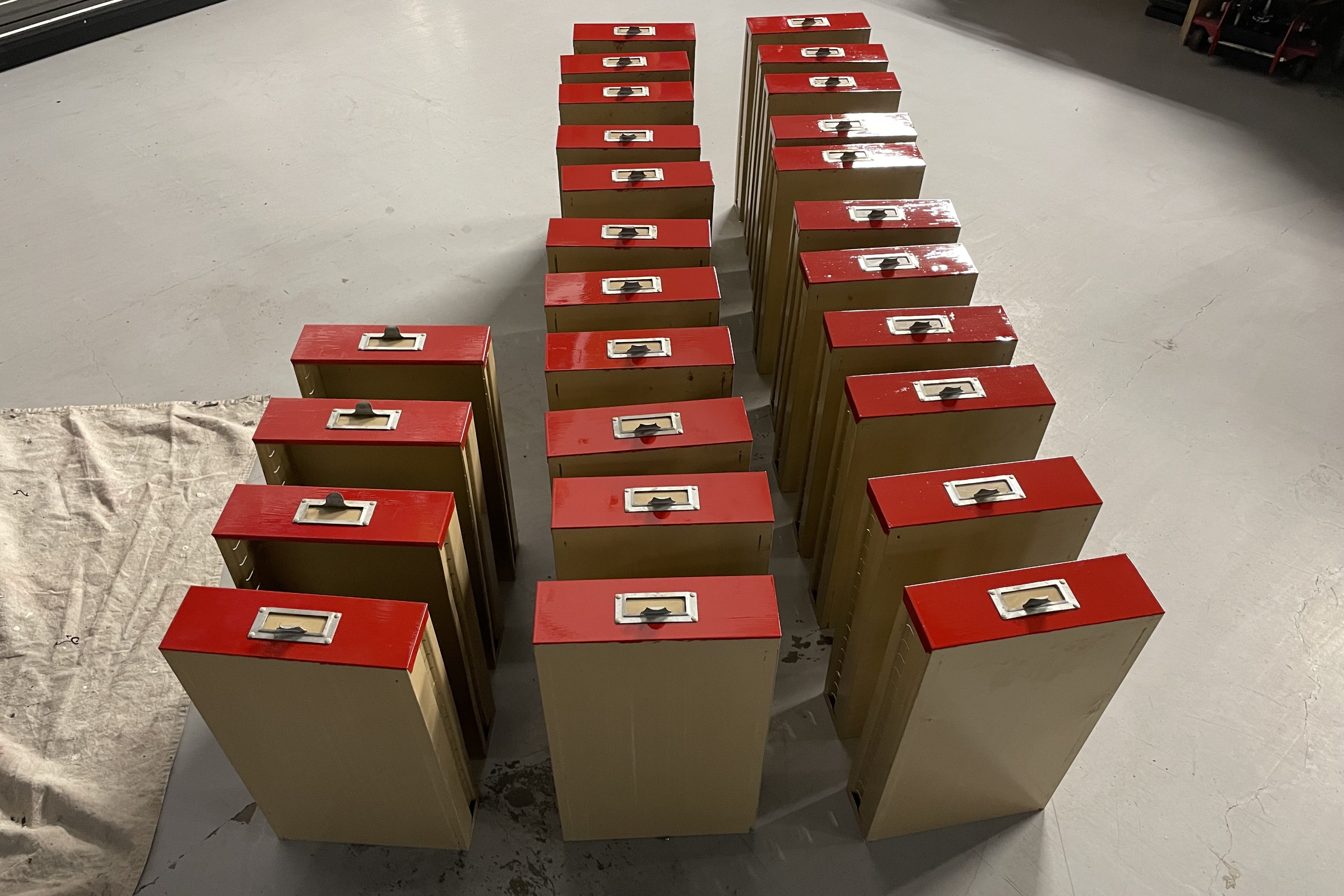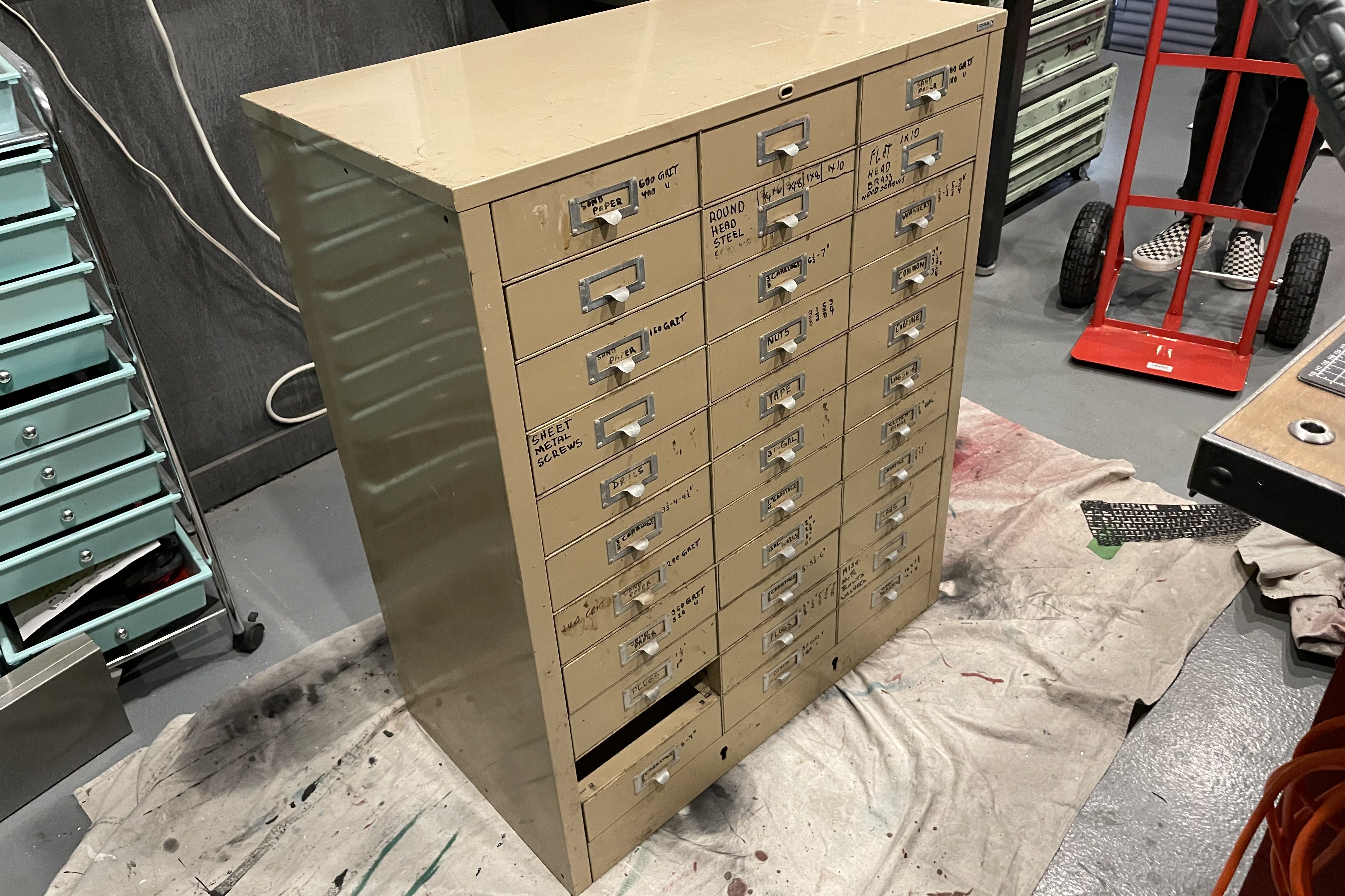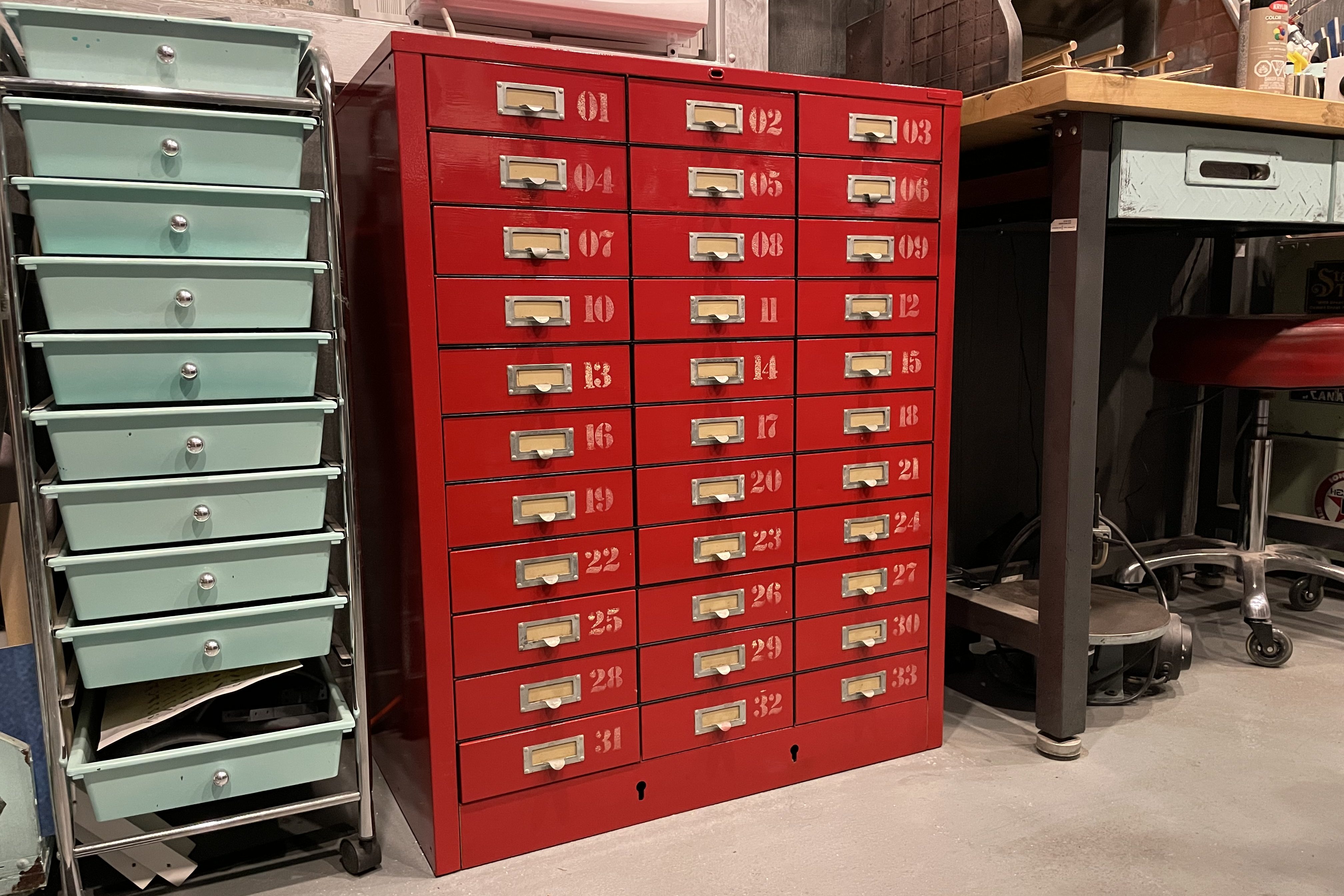 She’s a beauty! All steel and 33 more drawers for me to put cool stuff in! After a thorough cleaning it needed to fit in to my idea of coooool, so a good sanding, and a couple coats of red enamel and some hand lettering and weathering and it looks like it had been there since the mid-50’s…