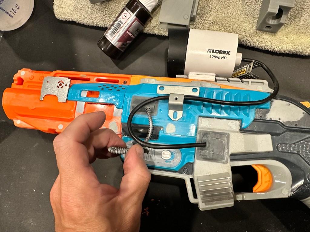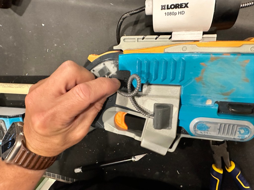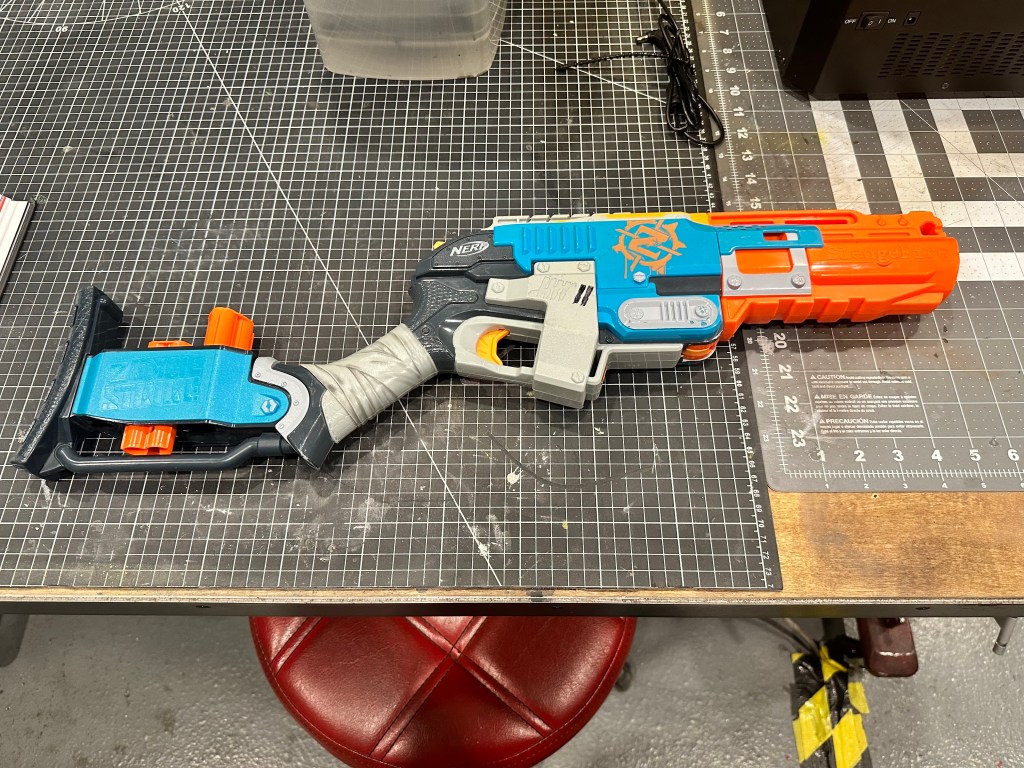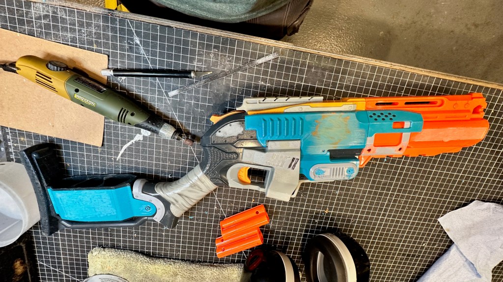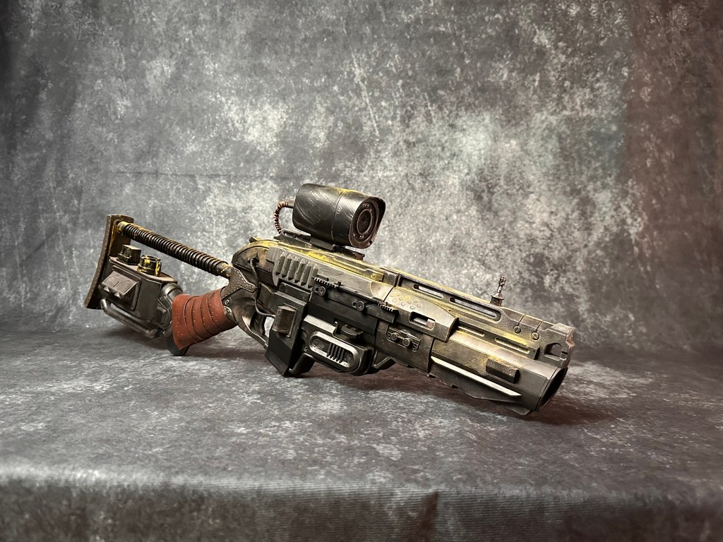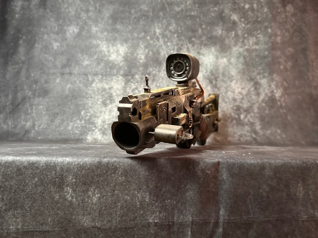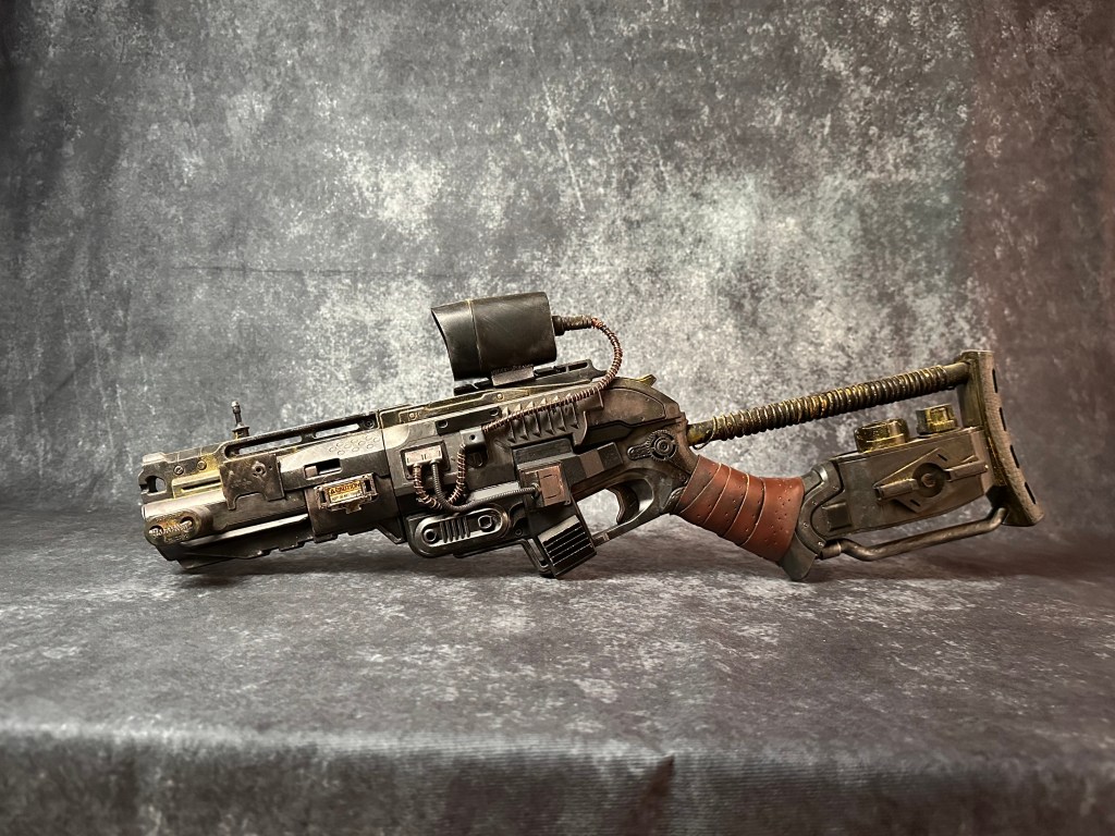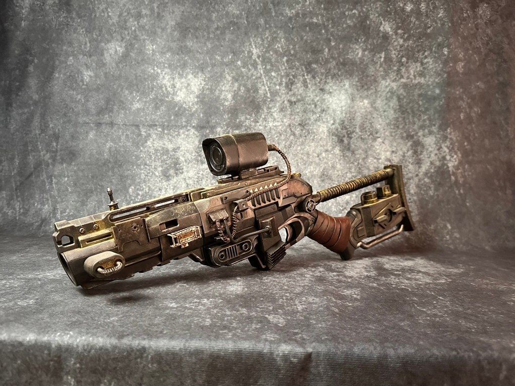 I had a friend tell me one day that a lot of my creations would fit right into the Fallout game franchise. I went “the whooby whatty?” So off I went to do some research…OMG, I TOTALLY belong in this world! I bought a beautiful art book about Fallout and that got the creative juices flowing! I picked up an armful of used Nerf guns for cheap and decided to do a Fallout inspired rifle. Sanding off of old logo detail, filling screw holes, adding new greeblies and some wire and a whole bunch of painting and here you have it. Anyone want their Nerf gun given the post-apocalyptic treatment?