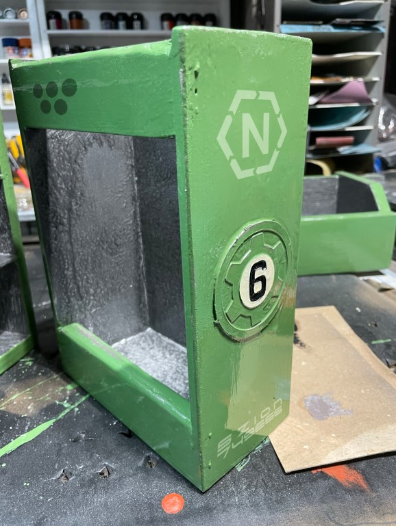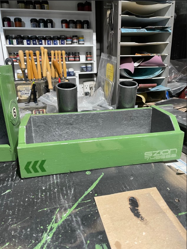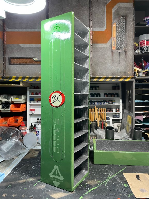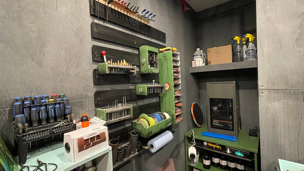 After doing some more Youtubing I discovered French Cleats! A simple channel of wood with a mating piece on a tool organizer. The number of shapes and sizes of tool organizers is limitless! So I set out to build myself a bunch. Plywood, styrene logos, some Sintra, and a lot of painting to make things look old and worn out (something I seem to have a talent for) and now I have a versatile way to display, organize, and retrieve things quickly and easily.