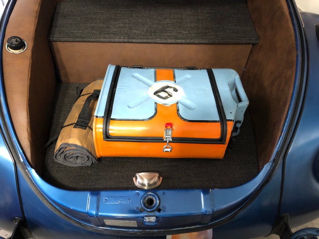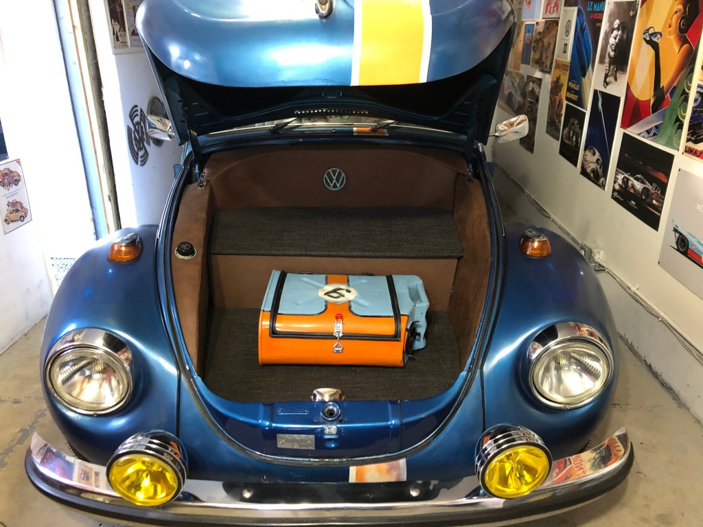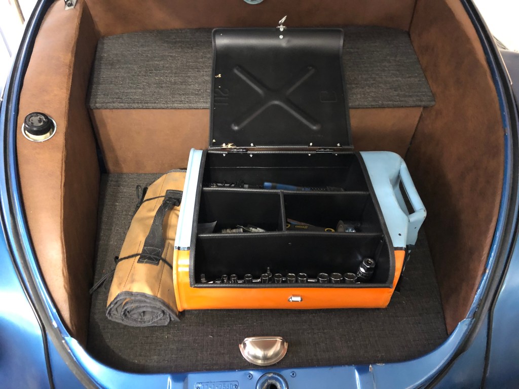 I was really lousy at taking progress photos of my projects in the beginning. Case in point is this tool box made out of a WWII gas can. Cleaned thoroughly then filled partially with water to absorb sparks I took my cutting wheel to open it up. I made some basic steel dividers which were riveted together. The inside was treated to some etching primer, then a couple coats of truck bed liner to make it nice and clean and durable. The outside go the classic Gulf Livery that you’ll see in so much of my stuff, including my beloved Volkswagen Super Beetle!