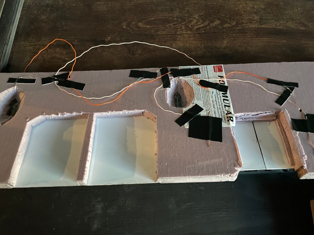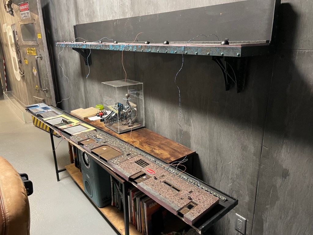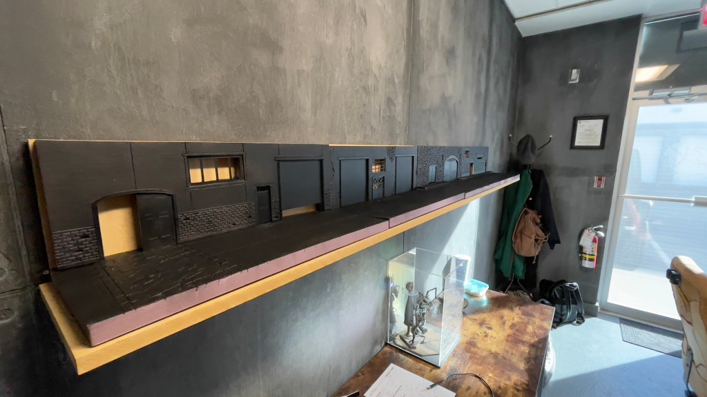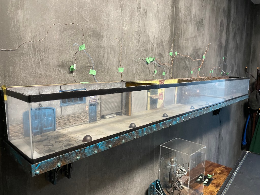 Speaking of 3D printing, I didn’t take any pics but the light fixtures as all printed as well, in various sizes. I didn’t take any pics of those, oops. OK, onto the wiring. I added micro LEDs to those light fixtures and also added “stage foot lights” ads I wanted to have lots of shadows cast to add to the ambiance. I also added a strip light all along the lid to create a “daylight mode” which is cool, but not nearly as cool as the night lights… There you have it! All in I’d say 120-ish hours to create the diorama!
