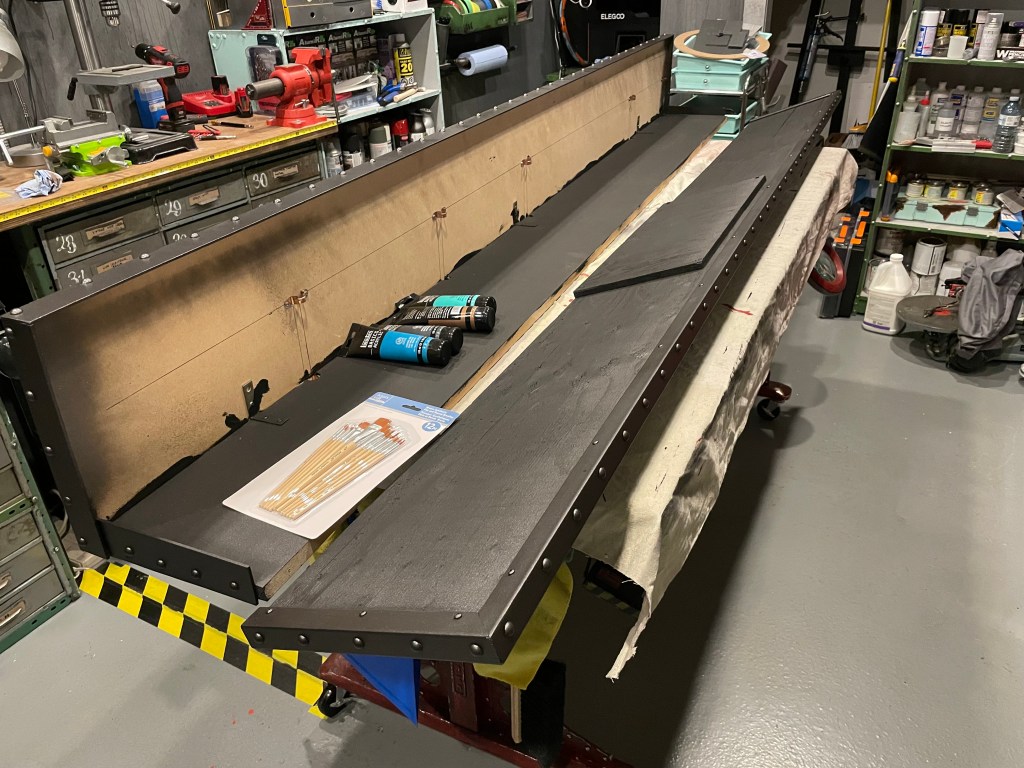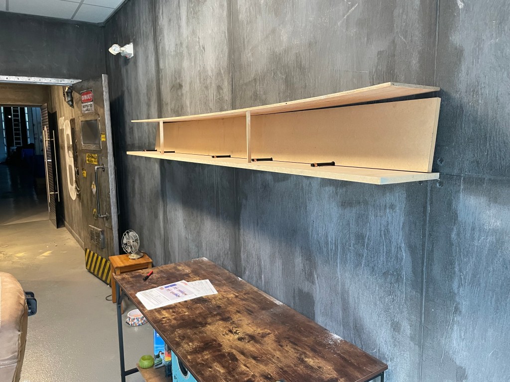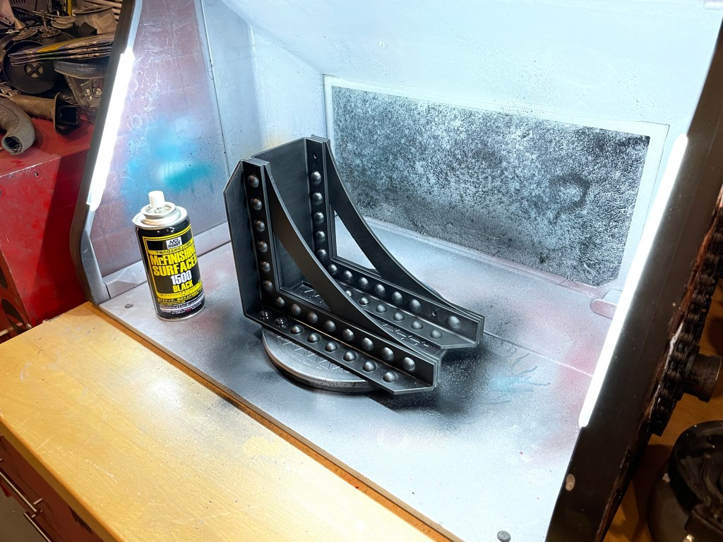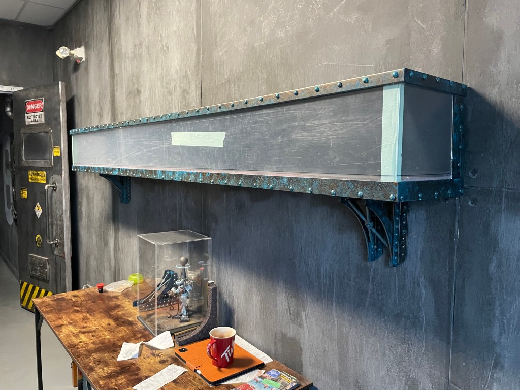 While the panels were drying I needed to get back to the shelf itself. Strips of Sintra sign scraps ( have access to a lot of great scraps thankfully, thanks @m2graphix !) Adding upholstery tacks to look lie rivets it was time to paint this thing! I wanted to try a different finish on this from anything else I had done in my shop so let’s try a copper patina. Oh, and the heavy industrial brackets you see are actually 3D printed by me. I LOVE the look of those..