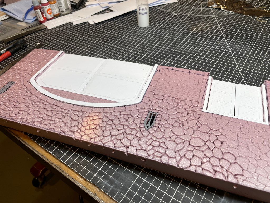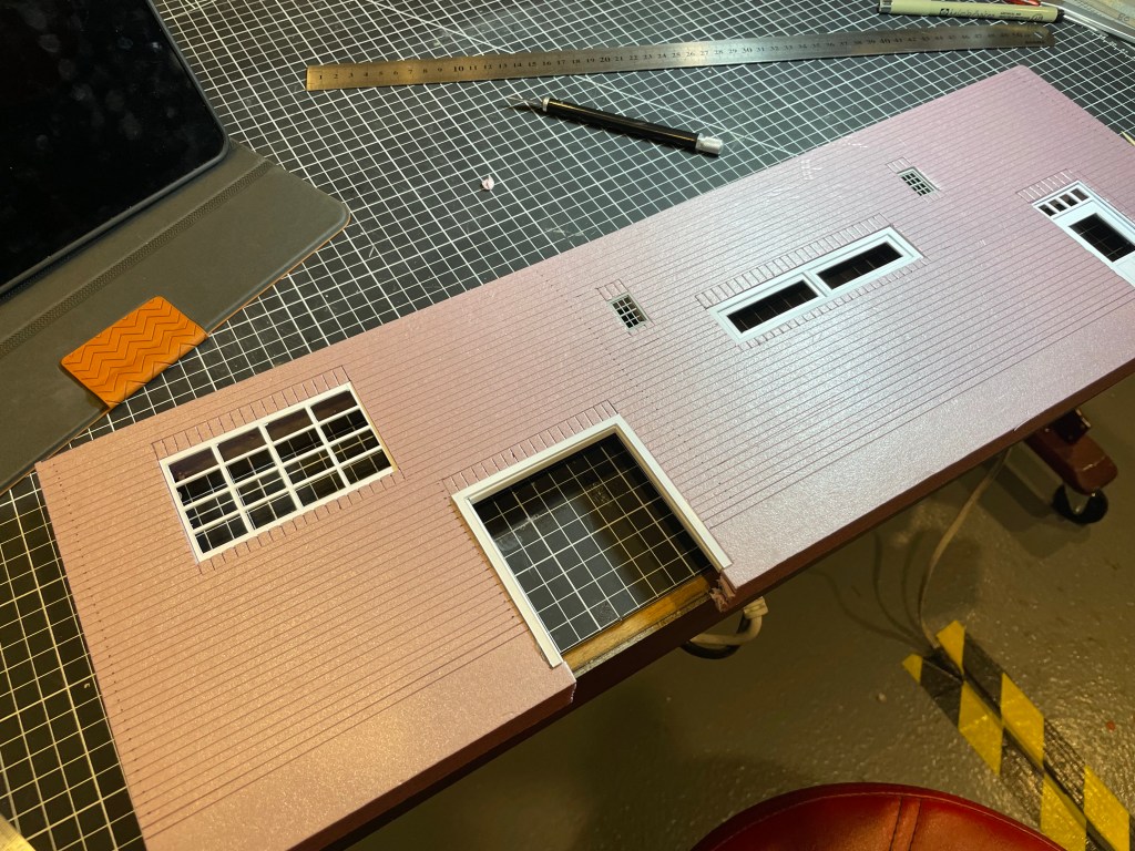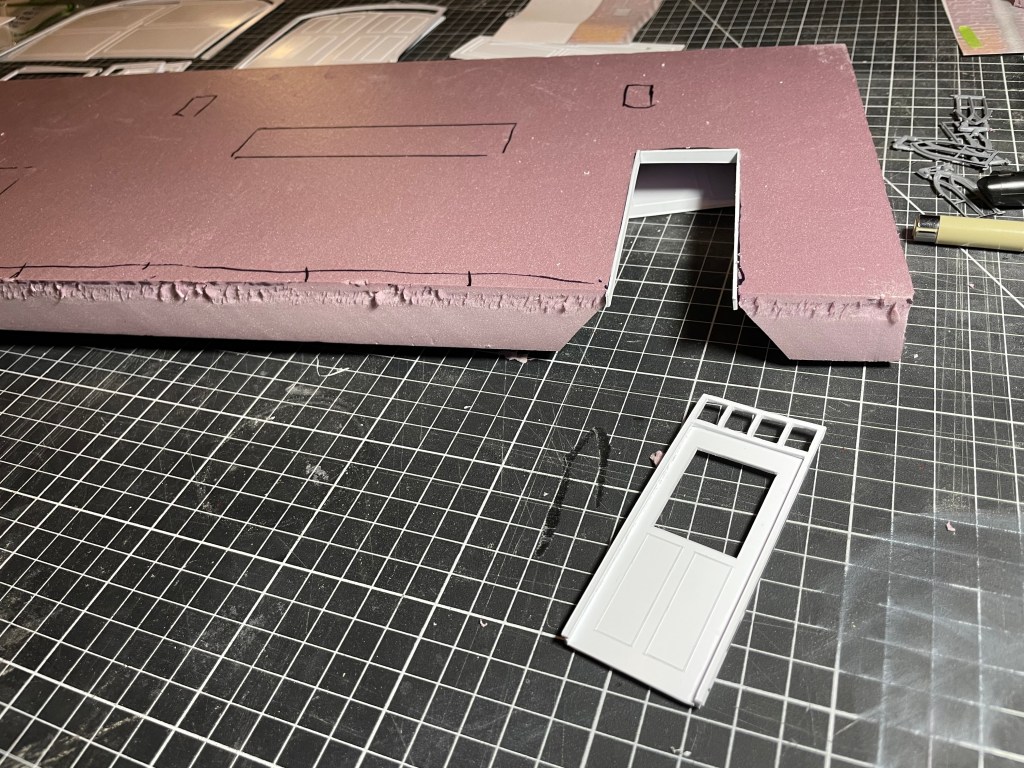 For basic details I cut out doors and windows from 1mm and 2mm styrene. 📣Public Service Announcement! 📣 Do NOT use E6000 adhesive to glue things to these foam panels! It looks like I dropped sulphuric acid on my first one! So that panel needed replacing 😂