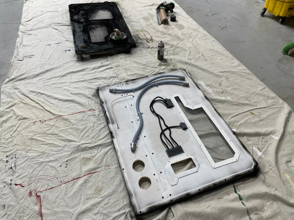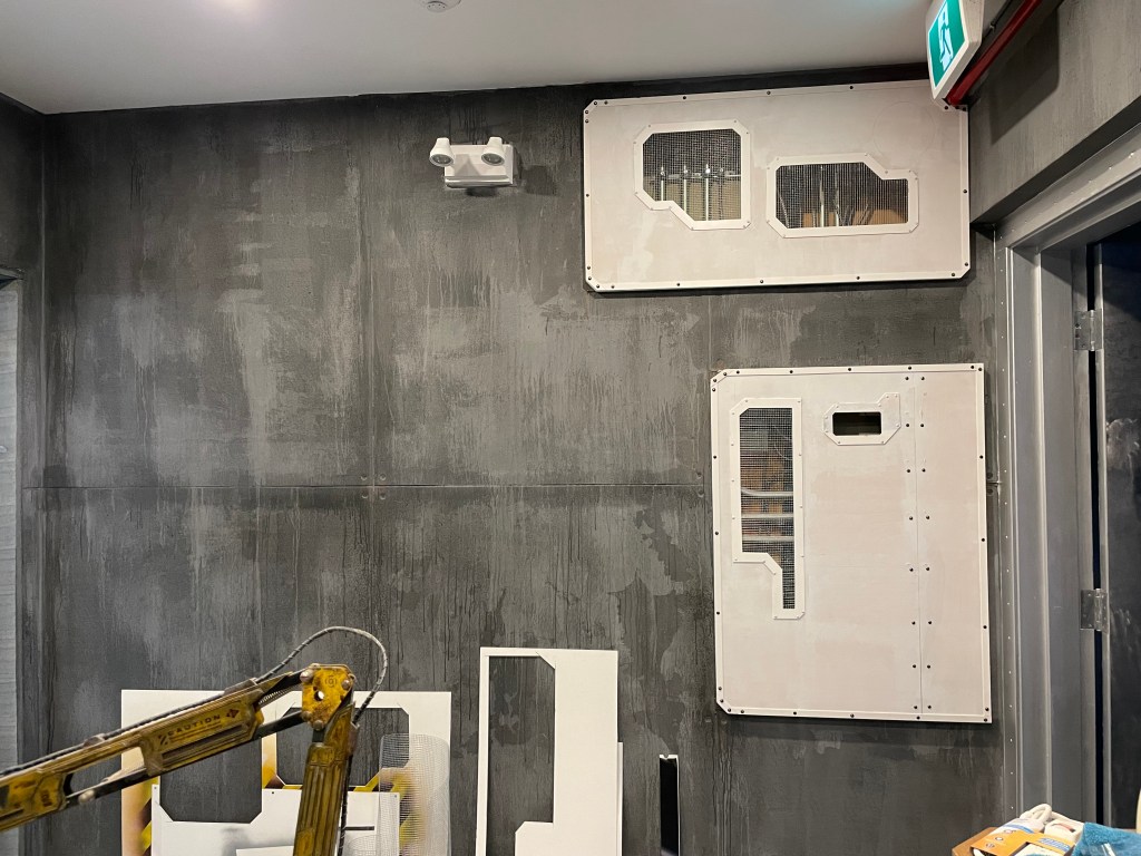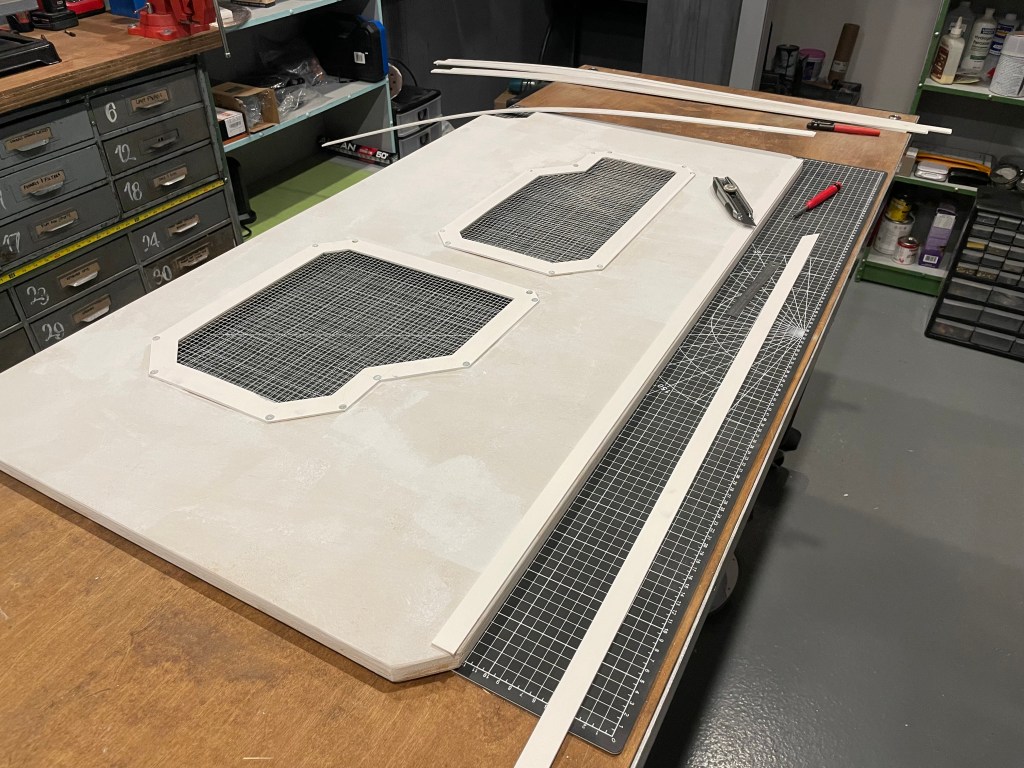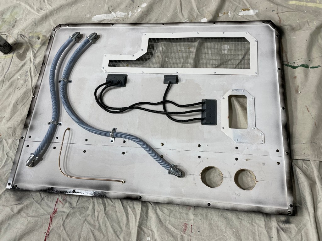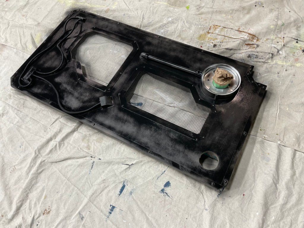 I had a fuse panel and access panel that needs something, so a little plywood, a bunch of greeblies and wires and some cool paint processes and voila! Unlike my garage cupboard doors, I actually had some depth to play with on these panels. I also mounted a light on the top panel that is remote controlled that flashes red when I have an online client meeting, letting everyone know KEEP OUT. Still not done… The woodwork needed sorting, so it got the full rivet and metalizing treatment. That helped a lot. Hmmmm, needs more…