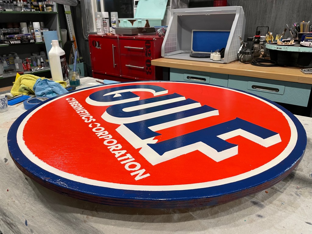 In the same category as of Motorsport Wall art I have always had a soft spot for the GULF livery and any old art that had the GULF logo. Again I wanted an old school original logo and needed to make it look like it’s been hanging on a building for decades. However, I gave it a bit of a twist. I imagined that a future version of the GULF company may get out of the fossil fuel world and into building robots and androids, thus it became the GULF Cybernetics Corporation! This “VW” logo is along the same idea. I imagined Volkswagen branching out into the space race and starting a division of “People’s Starships” This is a real retro-futuristic color palette and design and I get a chuckle every time I look at it 🙂