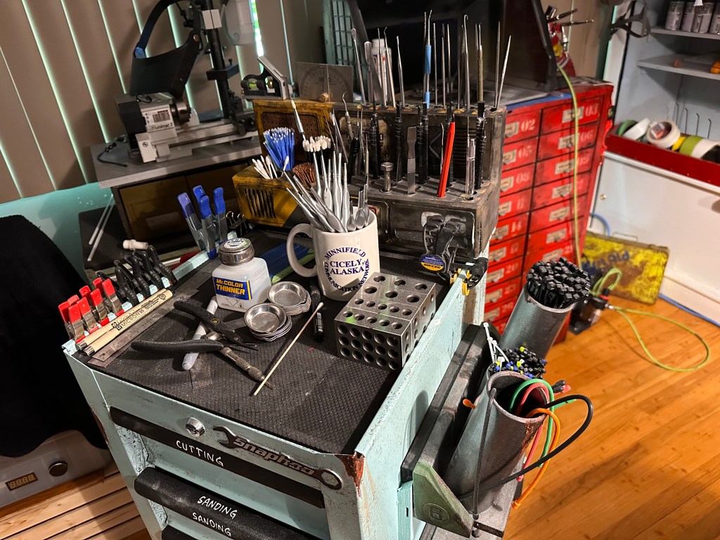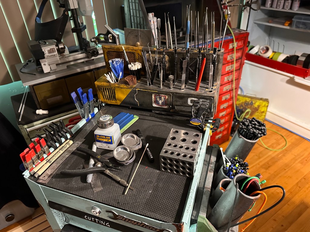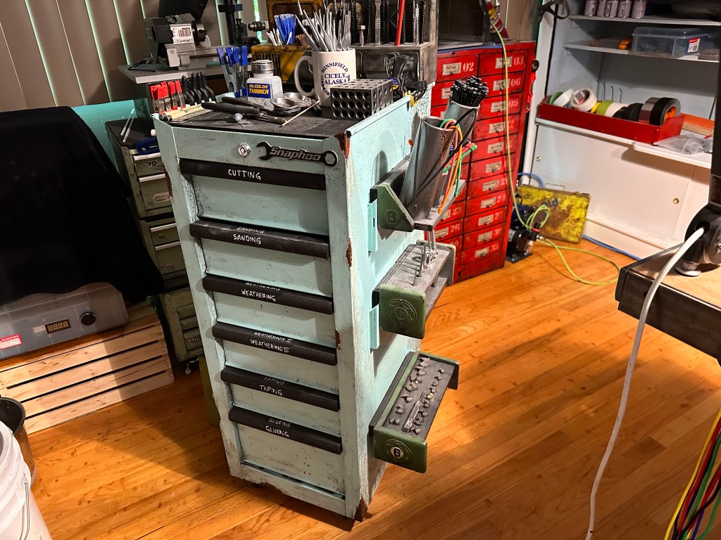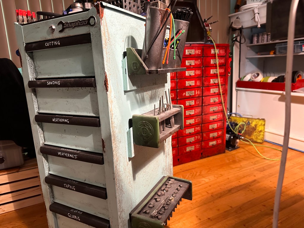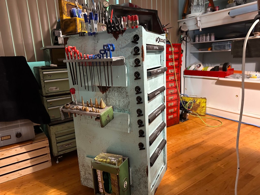 My current shop space is not bad but I have it spread across a couple areas which necessitates getting up to go grab stuff from here, there and everywhere. To make things more efficient I created this “war-wagon”. The cabinet was purchased from the fine folks at Princess Auto . It didn’t have wheels and that was a necessity as I want to be able to roll this to and from both work benches or get out of the way entirely depending on what I’m doing. Also I had a French cleat wall in my last shop but no where to mount here so all my cleat-mounted tools were just sitting on things taking up space. I mounted them on the sides of the war-wagon and now they have a home, at least for now. And it wouldn’t belong in my shop if it didn’t get the “Snaphoo” branding and patina that my other tool boxes have 🙂