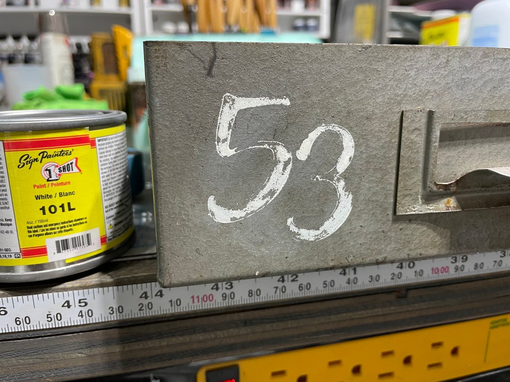 So clearly the patina on these were fantastic so the only thing I needed to do was label and number them. I had to dig out all my One Shot sign painting supplies and slowly get back my hand lettering mojo. By the end of this I was feeling pretty consistent. This is a skill you have to practice regularly to keep good. I’ll need to do more…